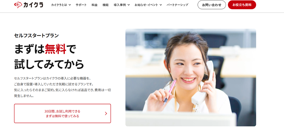 カイクラは、CTIとCRMの機能を兼ね備えたコミュニケーションプラットフォームです。導入に必要な機器を自身で設置・導入する「セルフスタートプラン」があり、30日間は無料でお試し利用ができます。