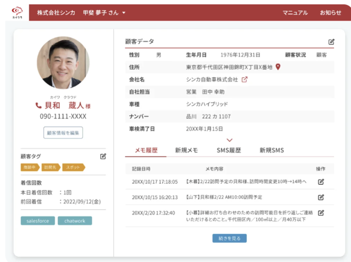 カイクラ導入後は、受電と同時に顧客情報を確認できるようになり、予約対応が格段にスムーズになりました。メモ機能によって、誰が誰に電話したのか、どの用件だったのかが一目でわかるようになり、社内を探し回る必要がなくなっています。