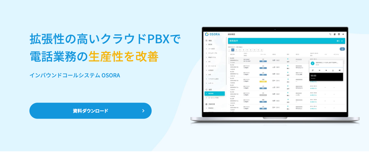 OSORAは、インバウンド対応に強いクラウドCTIで、CRMやチャットツールなどとの連携も可能な、比較的ライトなCTIです。