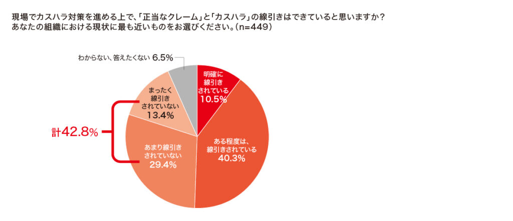 株式会社シンカの調査では、「正当なクレーム」と「カスハラ」の線引きができているか聞いたところ、「あまり線引きされていない(29.4%)」または「全く線引きされていない(13.4%)」と感じている組織が合計で42.8%にのぼることが判明しています。
