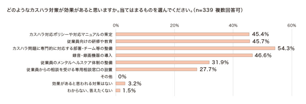 以下の調査結果にもあるように、多くの従業員が、カスハラの客観的な証拠を残すために録音・録画機器の導入を強く求めています。