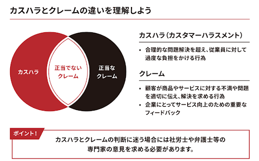 カスハラとは、顧客が従業員に対しておこなう過度な要求や暴言、脅迫などの迷惑行為を指します。正当なクレームとは異なり、セクハラやパワハラと同様に職場環境を悪化させ、従業員の心身に深刻な影響を及ぼすことがあります。