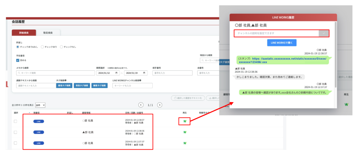 電話の通話録音はもちろん、SMS(ショートメッセージ)、LINE WORKS、LINE公式アカウントでのやりとりも含め、すべてを時系列で表示できます。