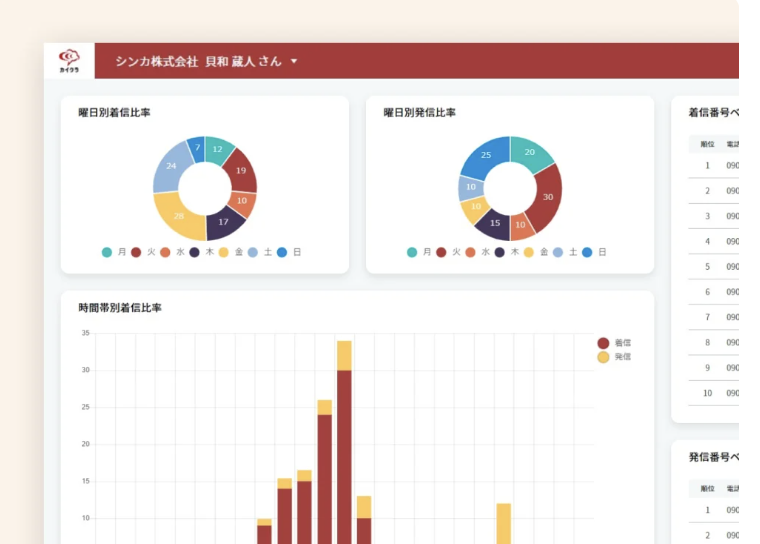 受電時の顧客情報のポップアップやメモ機能など、顧客にまつわる情報を社内で共有できるため、スムーズな対応や属人化防止に効果的です。曜日・時間帯別の電話量を把握できる分析レポートは、適切な人員配置に活用できます。