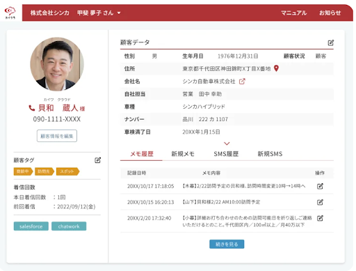 カイクラは、受電の瞬間に顧客情報がポップアップし、過去の対応履歴を確認できます。そのため「誰からの電話かわからない」や「担当者がわからなくて引継ぎできない」などの問題をまとめて解消でき、スムーズな顧客対応が可能です。