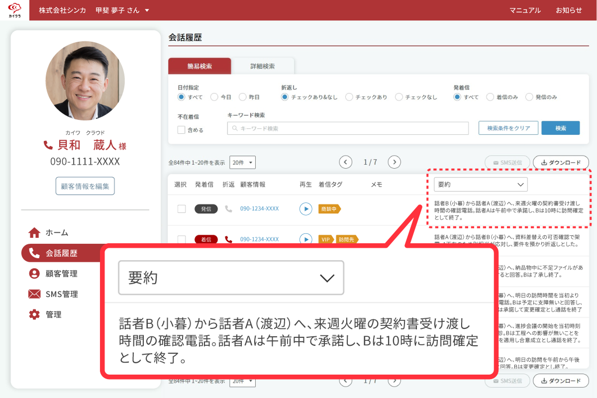 1つ目は、電話対応後の後処理時間を大幅に削減できる点です。電話業務で手間がかかるのは、通話そのものよりも、その後の会話記録の作成や上司への報告です。カイクラには、AI要約機能が搭載されています。通話が終了すると、すぐにAIが会話内容を解析し、わかりやすい要約文を自動で生成します。