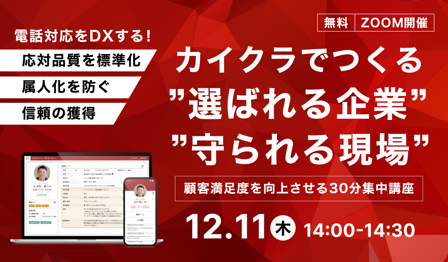 本セミナーでは、電話対応のDX化を実現するコミュニケーションプラットフォーム「カイクラ」を活用し、どの業界でも実現できる“選ばれる企業づくり”と“現場が守られる働き方改革”のポイントを、実際の事例を交えてわかりやすく紹介します。